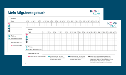 Im KOPF KLAR Migränetagebuch können Sie die wichtigsten Informationen zu Ihrer Migräne dokumentieren. Ein solches Tagebuch kann Ihrem Arzt bei der Diagnose oder Behandlung Ihrer Migräne helfen.
